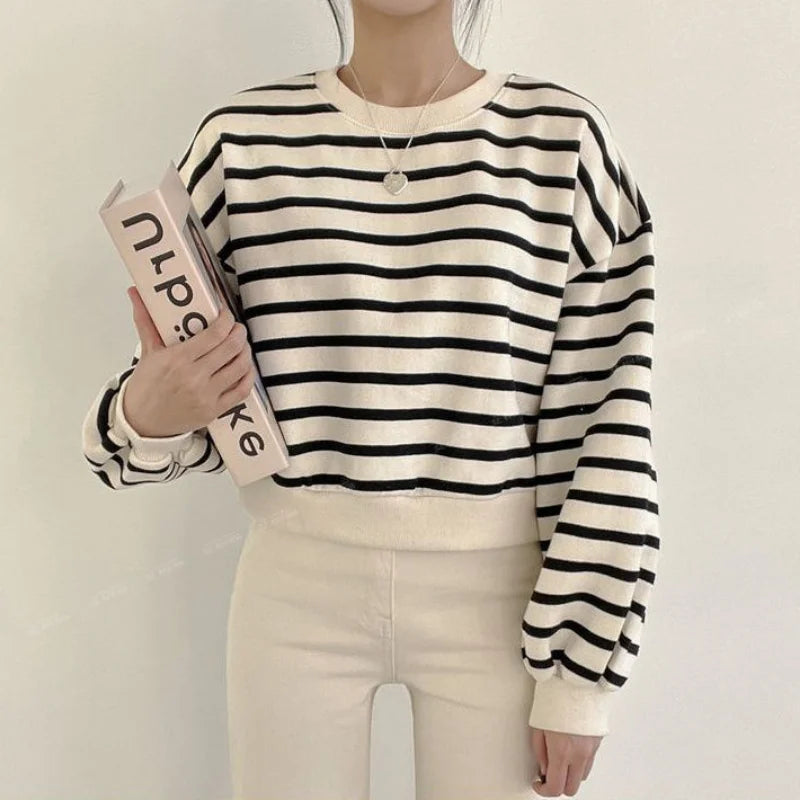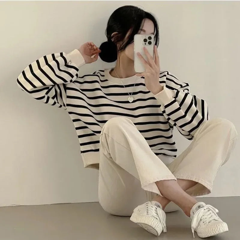 Striped Sweatshirt for Women New Autumn and Winter Pullover Round Neck Fashionable Loose Casual Long-sleeved Top
