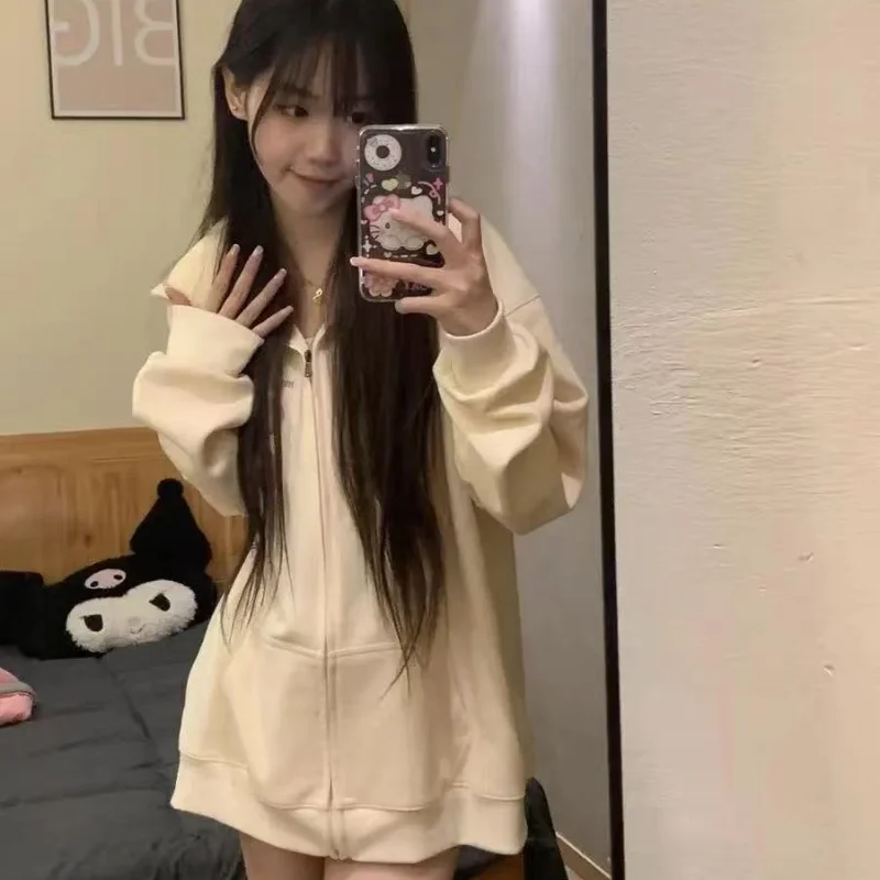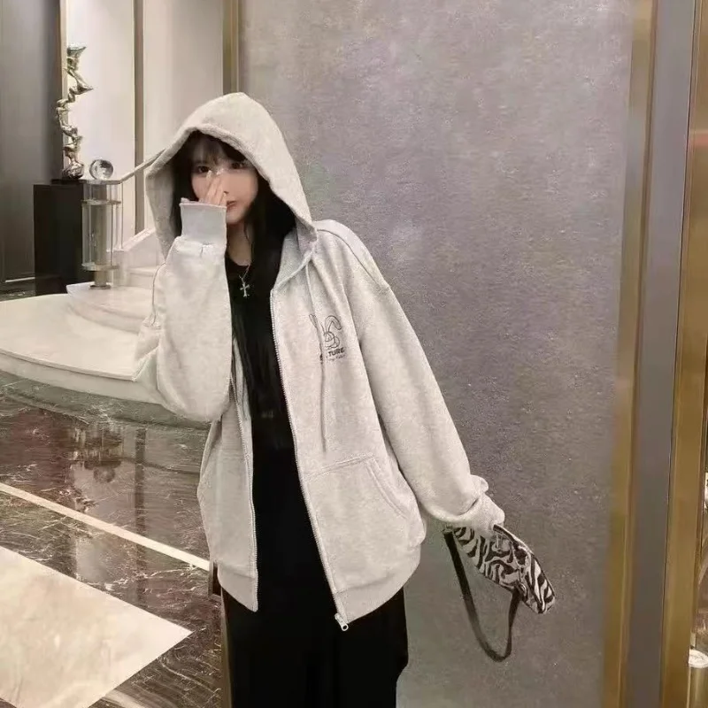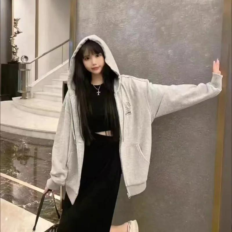 Women Embroidery Print Sporty Chic Hoodies Casual Zip Up Long Sleeve Loose Jacket Coats Harajuku Hooded Sweatshirts Streetwear