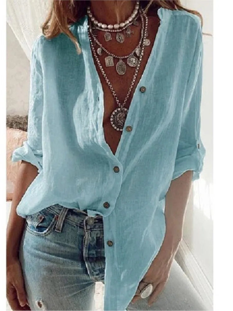 Women's Autumn New Solid Color Cotton Foldable Sleeves Loose Sexy V-neck Button Casual Comfortable Long Sleeve Top For Women