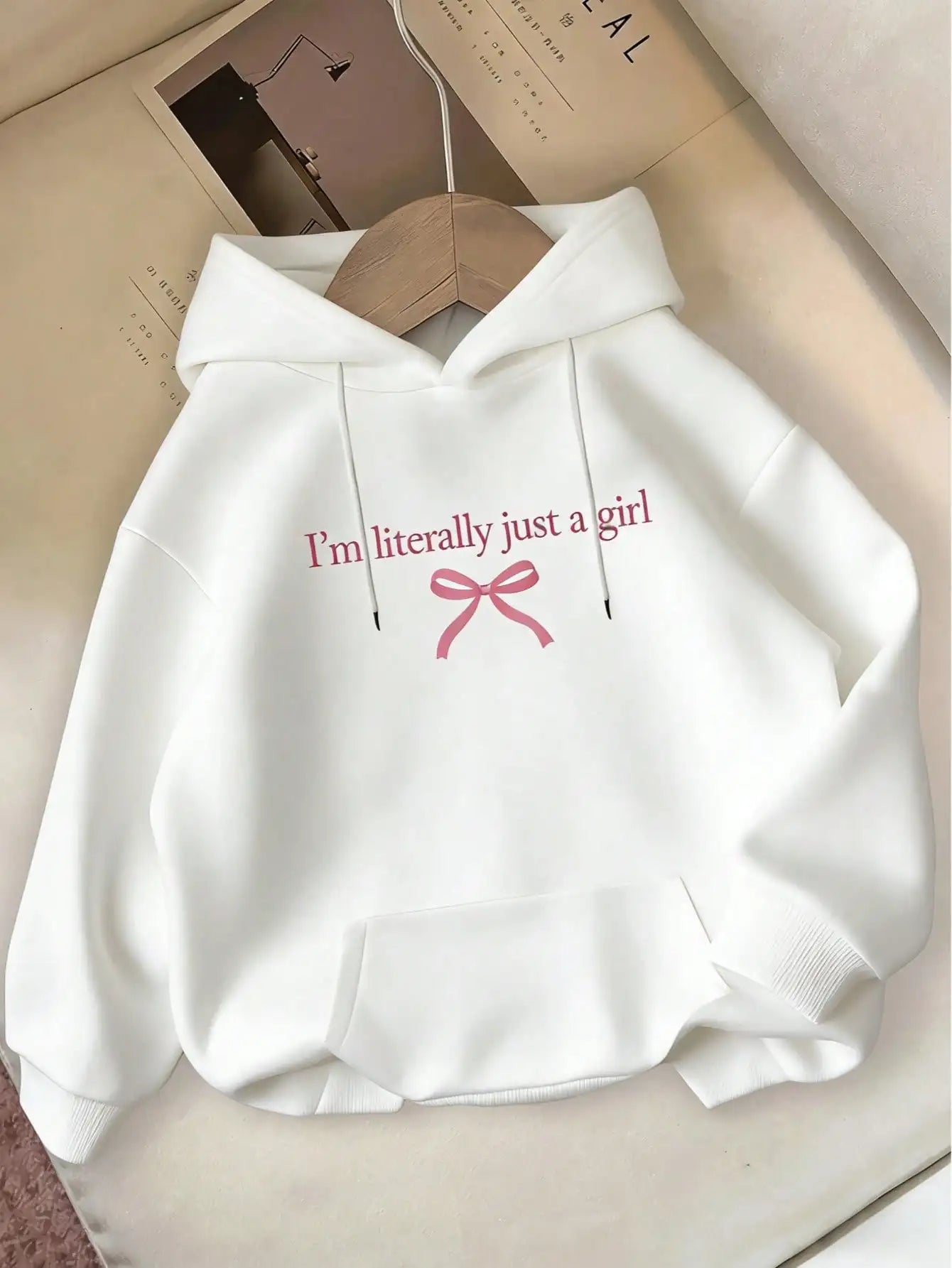 Women's Black Hoodie with 'I'm Literally Just a Girl' Print & Pink Bow, Cozy Fall Winter Pullover with Pockets